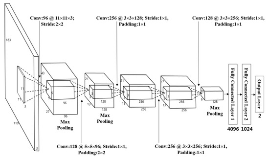As seen in this table and figure, the CNN in this research includes five convolutional layers and three fully connected layers [35]. Input images are the pedestrian and the non-pedestrian candidate images. As each input candidate image has a different size, this paper considers the ratio of the width and length of the general pedestrian, and resizes them into 119 pixels (width), 183 pixels (height), three (channels) through bilinear interpolation.