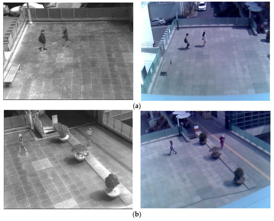 A number of studies are currently being conducted with a view to increasing the accuracy of the pedestrian detection schemes as intelligent surveillance systems are being advanced. In the past, visible light cameras were widely used [1,2,3,4,5,6,7], however, these cameras are quite vulnerable to factors such as varying shadows and lighting, and cannot accurately detect pedestrians during nighttime. To address such constraints, numerous studies on pedestrian detection systems using far-infrared (FIR) light cameras (thermal cameras) are being conducted [7,8,9,10]. However, pedestrian detection remains a difficult challenge as the differences between the pedestrian and the non-pedestrian areas decrease as the solar radiation causes the air temperature to reach the body temperature level. In order to address such issues, researchers have been exploring methods to use both visible light and FIR camera images. This includes a method of selecting the visible-light and thermal-infrared images under the dynamic environments as presented in [11], and a method of detecting the pedestrians by combining these two images [12,13,14].