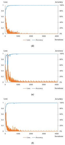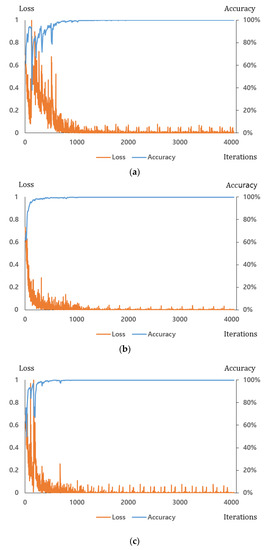 Unlike the gradient descent (GD) method, the SGD method defines the total number of iterations by dividing the training set by the mini-batch size, sets the training completion time until it reaches the total number of iterations (set as 1 epoch), and conducts the training for the preset number of epoch. The CNN training parameters are as follows: base_lr = 0.01, lr_policy = step, minibatchsize = 128, stepsize = 1013 (5 epoch), max_iter = 4054 (20 epoch), momentum = 0.9, gamma = 0.1, weight_decay = 0.0001, regularization_type = L2. The detail explanations of these parameters can be found in the following literature [53]. Figure 9 shows the loss and the training accuracy for the CNN training process along with the number of iterations. The loss graph converges toward 0, and the training accuracy reaches 100% as the iteration of the four folds increase. At this condition, the CNN is considered to be fully trained.