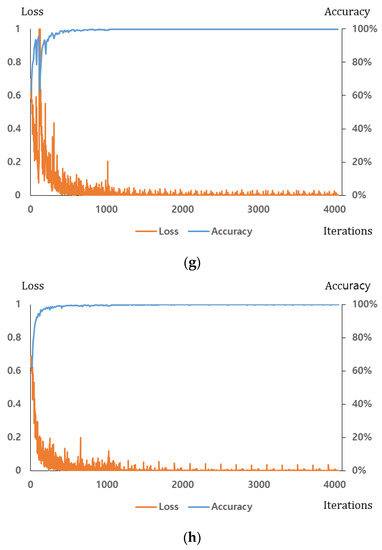 Loss and accuracy graphs of the training procedure: (a) the 1st fold (visible light candidate images); (b) the 1st fold (FIR candidate image); (c) the 2nd fold (visible light candidate images); (d) the 2nd fold (FIR candidate image); (e) the 3rd fold (visible light candidate images); (f) the 3rd fold (FIR candidate image); (g) the 4th fold (visible light candidate images); (h) the 4th fold (FIR candidate image).