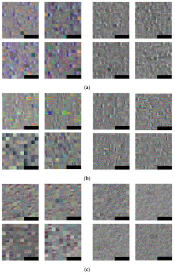 In addition, by comparing the shapes of filters of Figure 10a–c, we can find that the shapes of left four filters of Figure 10c from OSU color-thermal database is simpler than those of Figure 10a,b. In addition, the shapes of right four filters of Figure 10c do not show the characteristics of direction compared to those of Figure 10a,b. That is because the pedestrian or non-pedestrian candidates in OSU color-thermal database is smaller than those in the original DVLFPD-DB1 and the degraded DVLFPD-DB1 as shown in Figure 8, Figure 11 and Figure 12. Therefore, more local features are extracted from OSU color-thermal database through CNN training to discriminate the pedestrian and non-pedestrian candidates than those from the original DVLFPD-DB1 and the degraded DVLFPD-DB1.