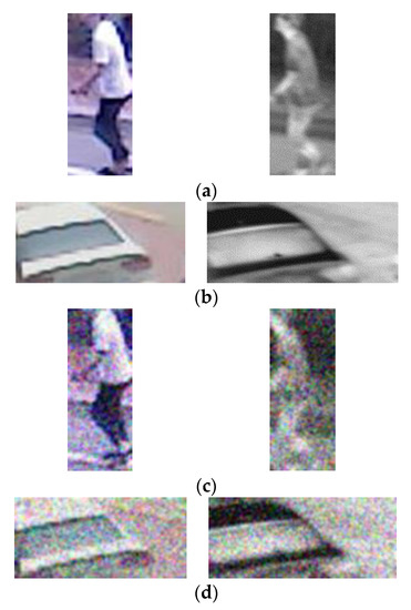 Examples of original and degraded DVLFPD-DB1. Original images of (a) pedestrian candidate, and (b) non-pedestrian candidate. Degraded images of (c) pedestrian candidate, and (d) non-pedestrian candidate. In (a–d), left and right images show the candidates from visible light and FIR light images, respectively.