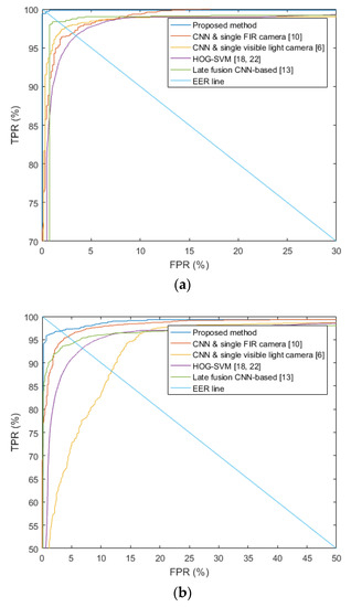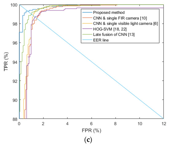 As explained before, FNR (100-TPR (%)) has the trade-off relationship with FPR. According to threshold of classification, larger FNR causes smaller FPR, and vice versa. Equal error rate (EER) is the error rate (FNR or FPR) when FNR is same to FPR. As shown in Figure 13, the accuracy of the proposed method is significantly higher than that of the previous methods.