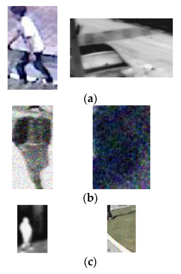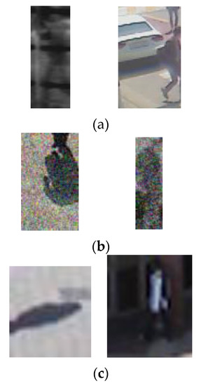 Figure 15 shows the examples of incorrect classification. In Figure 15a–c, the left and right images show the FP and FN cases, respectively. The FP errors happen when the shape of background is similar to a pedestrian (Figure 15a), lots of noise are included (Figure 15b), and the shape of a shadow is similar to that of a pedestrian (Figure 15c). The FN errors occur when the part of pedestrian is occluded in the candidate box (Figure 15a), lots of noises are included (Figure 15b), and a large background area is included in the detected pedestrian box (Figure 15a,c).