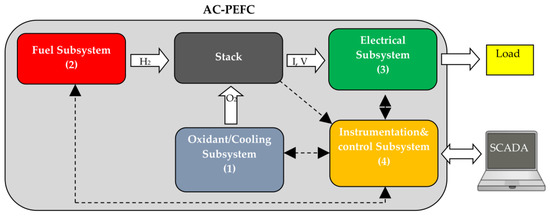 A fuel cell is an assembly integrated by a stack and several subsystems that make up the BoP. In the particular case of AC-PEFCs, the BoP can be divided into the following subsystems (see Figure 2): (1) Oxidant/Cooling subsystem: this crucial subsystem supplies air/oxygen (oxidant) at the appropriate conditions for the oxidant reaction, and it removes the heat (cooling) produced in the stack and keeps it at the right temperature; (2) Fuel subsystem: it supplies hydrogen at the appropriate conditions for the reduction reaction; (3) Electrical subsystem: it connects the stack to electric load; and (4) Instrumentation & Control subsystem: it processes sensors information to control actuators.
