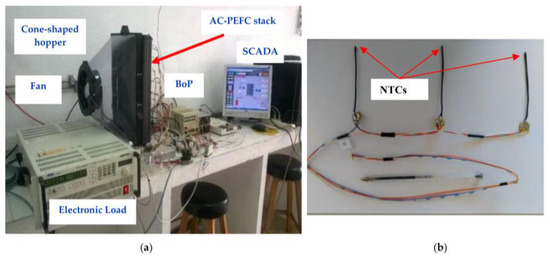 (a) AC-PEFC test bench. (b) Detail of a group three NTCs for three measurement points on a cell; normally left, center and right.