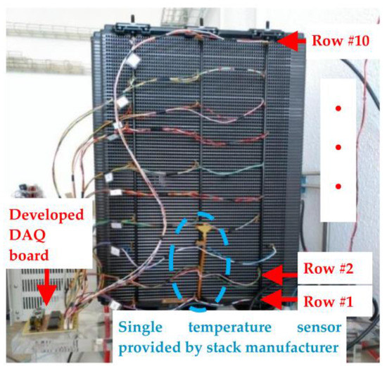 The measurement hardware is made from an array of NTC sensors. This array consists of a matrix of 10 rows and three columns (left, center and right of the cell), i.e., 30 NTC sensors. As we have mentioned above, each sensor is placed on a fixed-length rod, Figure 3b, which is inserted (Figure 4) on a cathode flow channel (the stack is based on an open-cathode design). This implementation assures that all the NTCs are in the same depth in the cell for all the 30 sensors. Additionally, the NTC sensor placement in the cells does not affect the performance of the cell because both the size of the sensor and the wiring are small enough to impede air from entering the cathode channel. Additionally, to perform a measurement point distribution that can provide a complete stack map, we have decided to place 10 sensing rows, leaving eight free cells between each sensing row (see Figure 4). Of course, for each particular application, the array of sensors should match the size of the stack (length and width). The manufacturer provides the stack equipped with only one temperature sensor (also a NTC), which is indicated in Figure 4. This will allow us to compare the experimental results obtained from the developed DAQ system with regard to the given temperature collected from the sensor that the stack incorporates. Precisely for this reason, we have decided to use the same NTC as the manufacturer, specifically the NTC NB20N50104KBA (please see Table 1).