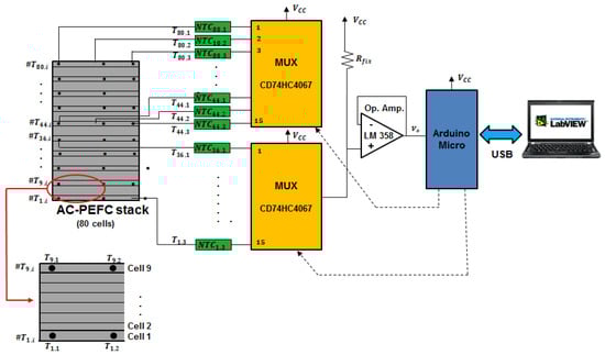 According to manufacturer data [41], the maximum temperature variation is given by a cell located in the middle of the stack (the hottest point, cell #40) and these placed on the upper (cell #80) and on the lower border (cell #1). This difference between the hottest and coldest points can rise up to 8 °C, so this corresponds to a maximum temperature variation of 0.2 °C/cell. In our case, as we have commented above, there are 10 sensing rows distributed along the whole stack and this corresponds to leaving eight free cells between each sensing row. This will correspond to a maximum variation of 8 cells × 0.2 °C/cell = 1.6 °C. Then, the developed DAQ system for cell temperature monitoring will give us enough temperature information about the cell temperature distribution. Additionally, distributing the sensors rows along the stack skipping the same number of cells between each consecutive sensing row, will give a real idea about the whole temperature distribution. If the user would like to have measurements in all the cells of the stack under study, 80 × 3 = 240 NTC sensors would be needed and therefore 240/16 = 15 analog multiplexers. However the goal of the paper and the developed prototype is to demonstrate the feasibility of the proposal, for which we have limited the number of analog inputs to 32 (two multiplexers of 16 inputs each one), with which we can cover 10 cells with three measurements each one (30 NTCs). However, the scalability of the design allows the number of inputs to be as many as the user desires. For example, by maintaining the same scheme as in Figure 5 and placing an additional multiplexer governed by Arduino, we could increase the number of DAQ inputs to 48 (16 × 3), and so on.
