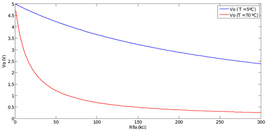 Arriving at this point, the only parameter whose value has not been yet justified is . Its value has been selected on basis of the following criterion: according to expression (1), measurable voltage, , depends on the NTC resistance, and in turn the NTC resistance depends on the stack operating temperature which, in this application, can vary from 5 °C–70 °C. Then, to choose the most suitable we have used an algorithm which represents versus (varying from 0–300 KΩ), and taking into account (from (3)) the minimum and maximum value of i.e., KΩ ( = 70 °C) and KΩ ( = 5 °C) (Figure 6).