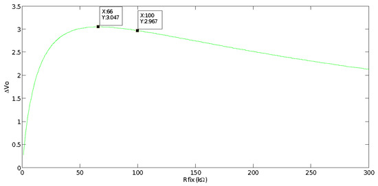 Difference between maximum and minimum voltage (), at 5 °C and 70 °C respectively, versus Rfix.