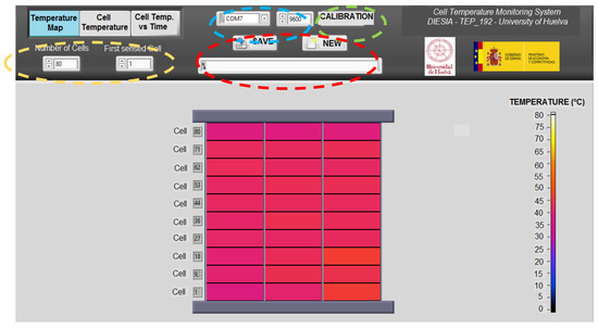 In this paper, a hardware/software data acquisition system for real time monitoring of cells’ temperature in Air-Cooled Polymer Electrolyte Fuel Cells (AC-PEFC) is developed. The temperatures of all the cells in an AC-PEFC stack, both together and individually, are recorded and monitored. For the development of the data acquisition (DAQ) system, we can choose between different software tools like Wonderware InTouch [17] (from the multinational enterprise Schneider Electric, Rueil-Malmaison, Hauts-de-Seine, France), IntellutioniFIX [18] (by the multinational General Electric, Boston, Massachusetts, USA), Siemens WinCC [19] (Siemens, Berlin, German), LabVIEW [20] (National Instruments, Austin, Texas, USA), as proprietary options. Among open-source options, we can find RapidSCADA [21] (RapidSCADA, Moscow, Russian Federation), OpenSCADA [22] (IBH Systems GmbH, Pfaffenhofen an der Glonn, Bavaria, Germany), IndigoSCADA [23] (enscada, Busto Arsizio, Lombardy, Italy). In this case, we have used NI Laboratory Virtual Instrumentation Engineering Workbench (LabVIEW) because of its widespread use around the world and the fact it supports several applications [24]. For example, Pany et al. [25] developed NI LabVIEW programs to reduce the stress on an electric drive fed by a fuel cell based hybrid source. Barbouche et al. applied [26] a monitoring system based on NI LabVIEW to a fuel cell test station to enable a mass flow controller and the solenoid valves control. Additionally, Segura [27] and Andújar [28], presented respectively a SCADA system implemented under NI LabVIEW for simulation and real-time monitoring of a modular PEFC system.