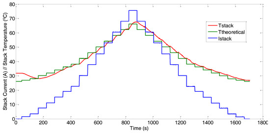 Based on the experimental results, Figure 10 shows the stack temperature variation with the load demand, but only at one point in the stack (this point corresponds with the position of the sensor supplied by the manufacturer). The result indicates that the temperature at this point follows the expected (theoretical) behavior; however, this does not allow any inference as to whether the complete stack is functioning properly.