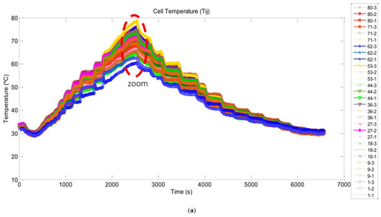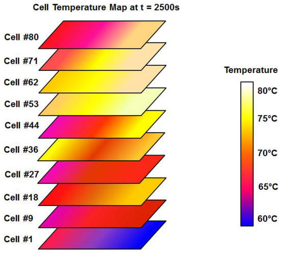 Once the temperature in the cells has been measured, it is possible to draw a surface temperature map like Figure 12. In this case, the data shown correspond to t = 2500 s, when the temperature in the cells achieves its highest value.