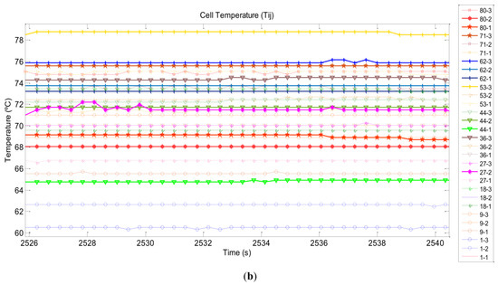 The NTC thermistors (T) are ordered in the stack surface by rows and columns (Ti,j), and they are put on the cathode side of the bipolar plates of the stack. Each sensing row is made up of three NTCs (see Figure 3b) which are placed on the borders (left and right) and on the middle of the cell (Ti,1, Ti,2 and Ti,3). This allows sensing of the temperature of the entire surface because of the 3-point measurements for each cell. Additionally, each row is repeated ten times along the stack (from T1,j row up to T80,j row), leaving eight cells (the stack used it this work has 80 cells) between each pair of sensing rows (Figure 4). Of course, this distribution can be adapted to any other structural stack design.