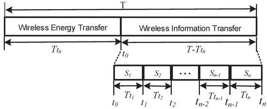 In the duration of the time slot , WET is performed and the access point transfers energy to n sensors by way of signal broadcasting. In the duration of the time slot , n sensors perform WIT and transfer information to the access point through the harvested energy.
