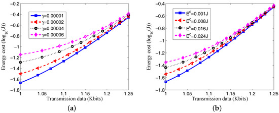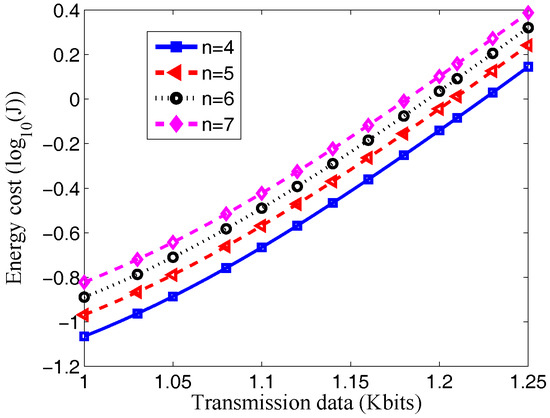It can be seen from Figure 3 that along with the increase in data size , more energy will be consumed. It is because the increase of data size requires more energy for data transfer and information processing. It can be observed from Figure 3a that with the same size of data transfer, more energy consumed in processing each bit of data suggests more energy consumed by the system. It is clear in Figure 3b that with the same transferred data size, the bigger the energy consumed by the circuit of the sensor, the bigger the energy consumed by the sensor. Furthermore, it can be deduced based on these two figures that when the transfer data size is smaller, for instance, bits, the difference between curves is bigger. It is because when is smaller, the energy consumed by the circuit of the sensor and the energy consumed by information processing take a greater proportion; when the transfer data size is bigger, such as bits, the difference between curves decreases because when the transfer data size is big, the energy consumption of the sensor is mainly energy consumed for data transfer. Moreover, Figure 4 shows that more energy is required as the number of sensors n increases. The reason is that as the number of sensors increases, sensors can collect more data and deliver the data to the access point, which consumes more energy.