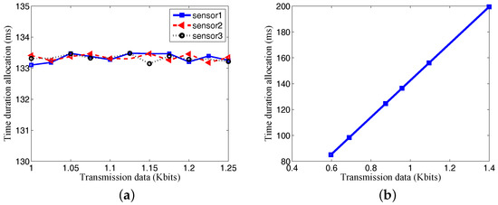 In this subsection, we discuss the relationship between transmission data size and time duration allocation . Figure 5a shows the effects of transmission data size on the time duration allocation. The X-axis represents the mean value of transmission data size that follows a uniform distribution. The Y-axis is the time duration allocation. From the figure, we can observe that the time duration allocated by sensors 1, 2 and 3 varies little with the increment of transmission data size. Compared with Figure 3, we can conclude that the size of data transmitted has a greater impact on energy cost than on the time duration allocation. Figure 5b shows how the system allocates time duration for each sensor when given a set of transmission data sizes. The X-axis represents the specific transmission data size and the Y-axis indicates the time duration allocation. From the figure, we can observe that the time duration allocation increases with the increment of given transmission data.