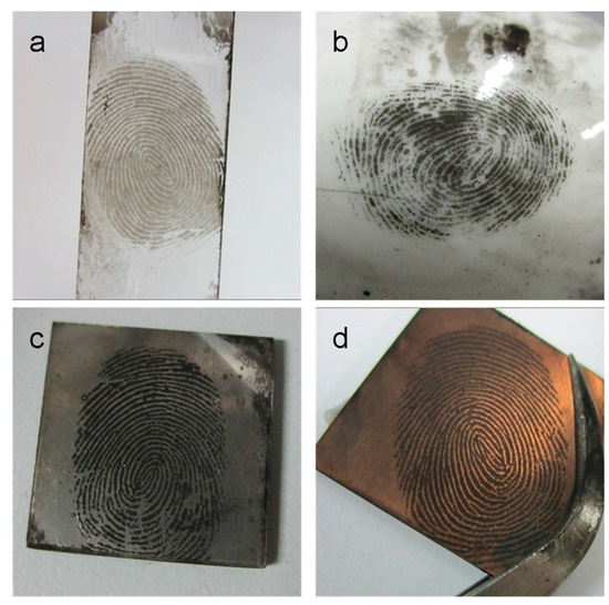- Zhang, M.; Yu, X.; Qin, G.; Zhu, Y.; Wang, M.; Wei, Q.; Zhang, Y.; Zhang, X. Latent fingerprint enhancement on conductive substrates using electrodeposition of copper. Sci. China Chem. 2015, 58, 1200–1205. [Google Scholar] [CrossRef]