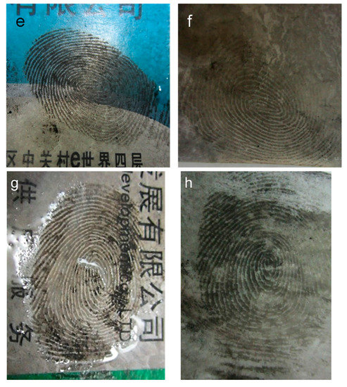 LFMs on various kinds of substrates which involve some porous/nonporous, conductive/insulative and smooth/rough surfaces have been further developed by CSC and the results are displayed in Figure 3. Figure 3a shows the LFM enhanced on a glass slide surface as a positive image. The second-level information such as the bifurcation, ridge termination, and crossover could be recognized distinctively. As for the LFM on a semi-porous ceramic material surface, the CSC technique was also able to enhance it with sufficient clarity to provide the second-level information shown in Figure 3b. The fingermarks on aluminum and copper materials which are commonly found on handled objects (door handles, bullets and etc.) have been well enhanced by CSC and the ideal fingermark image with second-level information shown in Figure 3c or Figure 3d, respectively. All the above results indicate that LFMs on the nonporous/semi-porous and conductive/insulative materials can be directly enhanced by using CSC without pre-treating the samples. In order to detect fingermarks on porous material surfaces such as paper, cardboard, etc., which are relevant in many crime scenes, LFM samples need to be pre-treated before CSC visualization to avoid sample damage due to its low ignition point. For example, LFM on cardboard which is often used in our daily life needs to be kept wet at first and then be developed by the CSC technique. Figure 3e exhibits the CSC-visualized fingermark on a normal cardboard surface which can also provide the second-level fingermark information. LFMs on paper card and copy paper can also be visualized by the CSC method (Figure 3g or Figure 3h). Therefore, it is proven that this CSC approach is capable of visualizing LFMs on a wide range of substrates.