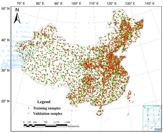 Cropland sampling points were used to assess the accuracy of existing cropland datasets and for validation of the synergic cropland map, which were provided by Tsinghua University []. In the sampling frame of Tsinghua University, entire globe was divided by hexagonal scheme using DGGRID software, and then 10 samples were assigned randomly in each hexagon. The land cover types of sampling points were identified by visual interpretation via high resolution images. Although this sampling method can ensure the uniformity and objectivity of the distribution of the samples, the total number of cropland samples in China was only 443, which is insufficient for evaluation. Thus, a stratified random sampling method based on agreement of the five cropland mapping products was used to collect more samples, with land cover types determined by visual interpretation of Google Earth images. The images in 2010 or around 2010 were generally used for sample selection. When the images around 2010 were not available, time slider of Google Earth was moved to search for the images before 2010 and after 2010. These images were compared to determine the land cover types of the samples. If the sample remains unchange before and after 2010, it was considered to be a sampling point, otherwise it was removed. The final numbers of cropland and noncropland samples were 2800 and 2851, respectively. Approximately half of the total sampling points were used for training to rank the five cropland maps, and the rest were used for validation to assess the accuracy of the new hybrid cropland map (Figure 1). Statistics of cropland area at provincial level in the base year of 2009 were acquired from the Second National Land Survey. The cropland definition of statistics is similar to that used by the Food and Agriculture Organization (FAO) of the United Nations. These statistics were estimated using cropland polygons derived by visual interpretation of aerial photographs with ground survey assistance, and the areas exclude the cropland ridge.