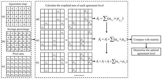 Flowchart on determination of the optimal agreement level. (a) Agreement map; (b) Average percentage; (c) Pixel area; (d–f) Calculations of cropland area with agreement level 5, 4, and 3 respectively.
