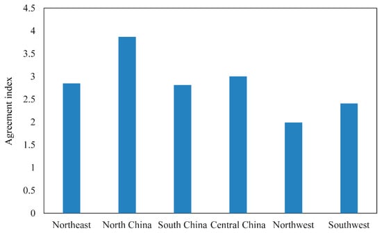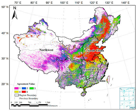 Figure 3 shows the areas of agreement and disagreement of the five cropland datasets. The values 1–5 stand for the agreements for pixels. A higher value indicates higher agreement, i.e., a value of 5 reflects complete agreement between the five datasets; a value of 4 indicates that four datasets classify the pixel as cropland. In order to simplify analyses, the study area was divided into six regions according to the neighborhood provinces, i.e., the northeast, north, central, south, northwest, and southwest parts of China (Figure 3). High agreement is shown in the large homogeneous regions, such as the plains in northeast and north China, which are the major grain-producing areas. The spatial agreement becomes lower in moving from these major grain-producing regions to the farming-pastoral areas, and is lowest in the pastoral areas. The agreement index, the mean of the agreement values in each region, was used to determine the spatial agreement quantitatively (Figure 4). North China have the highest agreement index (3.87), followed by central and northeast China. As the major grain-producing regions, the cropland areas are intensively used and continuously distributed because of the homogeneous landscape. By comparison, the northwest has the lowest agreement index. Because this region is typified by farming-pastoral areas (such as Shaanxi and Ningxia provinces) and pastoral areas (such as Tibet and Xinjiang provinces), there is a wide mosaic of cropland and pasture, making classification difficult. Because the classification systems of CCI-LC and GlobCover 2009 include mosaic classes of cropland, low spatial agreements in the northwest of China are obvious.