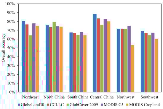 The accuracies of the input datasets are crucial for building the score table. Figure 5 presents their overall accuracies assessed using an error matrix based on training samples in each region. In northeast, central, and southwest China, GlobeLand30 achieves the highest overall accuracies (80.50%, 88.47%, and 69.23%, respectively). In south and northwest China, MODIS C5 produces the highest accuracies (68.00% and 75.09%), and GlobCover 2009 achieves the best performance in north China with overall accuracy of 79.52%. Among the five datasets, MODIS Cropland has lower accuracies in most regions. Using the overall accuracies, the five input products were ranked in each province to build the corresponding score table.