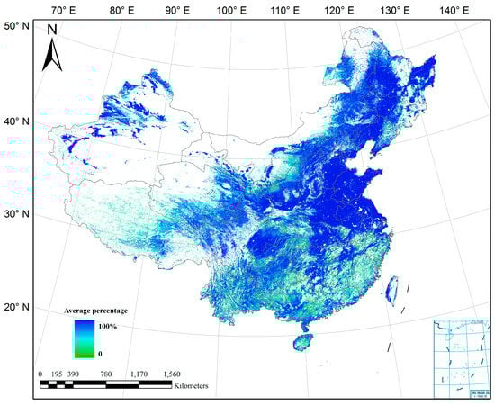 Satellite images provide an efficient data source from which to derive cropland extent over large areas. In recent decades, several global and continental cropland datasets have been derived from remotely sensed data and made freely available to the public. Early cropland products generally employed coarse resolution images (pixels of 1 km or similar), such as International Geosphere-Biosphere Programme Data and Information Systems Cover (IGBP-DISCover) product [], University of Maryland (UMD) product [], and Global Land Cover 2000 (GLC2000) dataset []; however low accuracy and image quality limited their application at national or regional levels. Later, the spatial resolution of cropland datasets was improved to 500 m and then 300 m, such as MODIS Collection 5 (MODIS C5) Land Cover Products, and GlobCover 2009 [,]. Today, land cover mapping with high-resolution images has gained increasing attention in the scientific community because of the free availability of the Landsat archive, which has allowed production of 30 m resolution land cover datasets such as GlobeLand30 and Finer Resolution Observation and Monitoring-Global Land Cover (FROM-GLC) [,]. However, there is considerable inconsistency among these cropland mapping products, especially in heterogeneous landscape areas such as transition zones, as they have been produced using data from different sensors, using different classification features and classifiers [,]. Some studies have suggested that discrepancies also occur as a result of different classification schemes and cropland definitions [,,]. Furthermore, the cropland areas estimated by these products differ from the official statistics, because mixed pixels are inevitable in remote sensing images, especially in coarse images [,]. Although some maps, such as GlobCover 2009 and Climate Change Initiative Land Cover (CCI-LC), contain mosaic cropland classes representing a combination of multiple classes, it is quite difficult to estimate cropland areas from maps with high accuracy because they do not provide precise percentages of the cropland [].