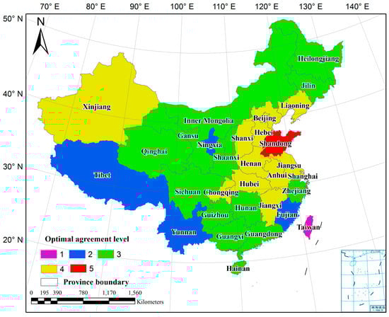 Compared with other synergy approaches, HOSA simplifies the method of score assignment [,,,]. Existing approaches built a long and static table to determine the cropland and noncropland areas, with 32 scores for the five input datasets, which was strenuous and time-consuming. Instead, HOSA first determined the optimal agreement level, and then built a dynamic score table in each province. The optimal agreement levels for most provinces ranged from 2 to 4 (Figure 7), and the score table was built according to the agreement level, which greatly reduced the size of the score table with an improved efficiency.