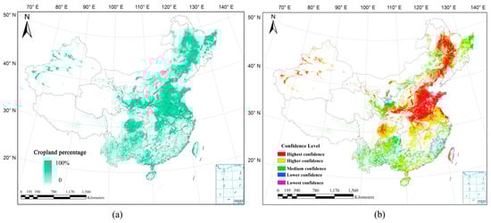 The overall accuracy of each cropland dataset was calculated for each province, and the cropland datasets were ranked using their overall accuracies. Next, a score table of product combination was established in each province, and the optimal combination of input datasets was determined using the statistical data for calibration. From the synergy results shown in Figure 8a, it is evident that high percentages of cropland are mainly located in the plains and basins (e.g., Weihe Plain, Huang-Huai-Hai Plain, Northeast Plain, Yangtze River Basin, and Sichuan Basin), while low percentages are found in plateaus and hills (e.g., Loess Plateau, Yunnan-Guizhou Plateau, Tibet Plateau, and Southeast Hills), which accords with the real situation. For each pixel of the cropland percentage map, a confidence level was defined according to the agreement value of the five input datasets. Because a high agreement value generally means high interpretation quality, the values from 1 to 5 were defined as lowest, lower, medium, higher and highest confidence, respectively, and the cropland confidence map can represent the quality of synergy result in detail (Figure 8b).