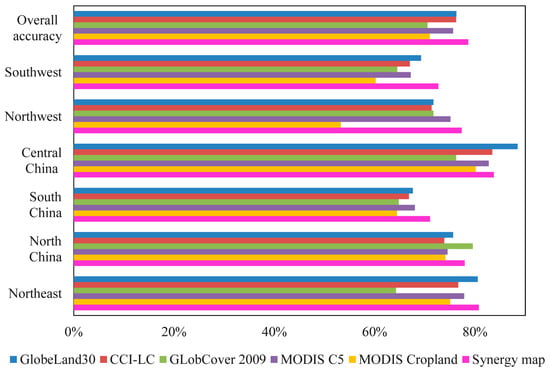 The accuracy of synergy map was further compared with the original five cropland datasets. Error matrix was also used to assess the accuracies of the five cropland maps using the same test samples of synergy map. The overall accuracies of the input datasets and synergy result in the different regions are shown in Figure 9. The overall accuracy of the synergy map is higher than the input datasets. GlobeLand30 among the five cropland datasets has the highest overall accuracy (76.27%), followed by MODIS C5 (76.22%) and CCI-LC (74.22%). The accuracies of GlobCover 2009 and MODIS Cropland are relatively lower which are 70.50% and 70.96%, respectively. This conclusion agrees well with that by Yang et al., []. At the regional level, except for central China and north China, the synergy map has the highest overall accuracy in most regions. This implies that the synergy approach can take advantage of multiple datasets to establish a more accurate hybrid map.