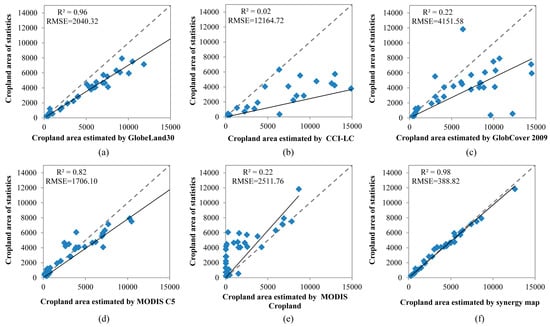 Scatterplots of cropland area from statistics and those estimated by GlobeLand30 (a); CCI-LC (b); GlobCover 2009 (c); MODIS C5 (d); MODIS Cropland (e) and synergy map (f).
