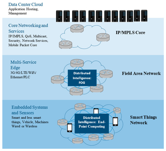 - Yannuzzi, M.; Milito, R.; Serral-Gracia, R.; Montero, D.; Nemirovsky, M. Key ingredients in an IoT recipe: Fog Computing, Cloud computing, and more Fog Computing. In Proceedings of the 2014 IEEE 19th International Workshop on Computer Aided Modeling and Design of Communication Links and Networks (CAMAD), Athens, Greece, 1–3 December 2014; pp. 325–329. [Google Scholar]