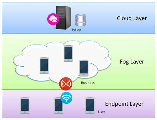 Fog computing was introduced by the Cisco system in 2014 dealing with the part of workload and services locally on fog devices (for instance, routers, switches, embedded servers, video surveillance cameras, and industrial controllers), instead of being transmitted to the cloud. As shown in the fog architecture in Figure 1, the new intermediate fog layer is placed between cloud and end-users [32]. The fog layer consists of geo-distributed fog servers, which are highly virtualized computing systems with the large volume data storage, and compute and wireless communication facility. These servers can be deployed anywhere with a network connection, such as stores, restaurants, railways, and vehicles [33]. Due to the fog layer position, the distance between fog server, the end-users, and the cloud layer is only single-hop wireless connection; thus it supports low latency, location awareness, and quality-of-service (QoS) for stream and real-time application [25,34]. Besides, Fog computing is aimed to analyze and process data in devices within the network by running applications rather than in a centralized Cloud; thus, it consequently could deal with the ever-increasing number of connected devices [35].