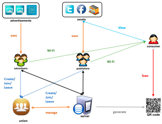The mechanism of a Wi-Fi union is to group different advertisers and publishers, and to merge their own Wi-Fi networks into a union or community. This allows the partners of both advertiser and publisher to share their advertisements to consumers who are using the Wi-Fi network of the advertisers or publishers in the community. Similar to advertiser and publisher, Wi-Fi union is placed at fog layer in the system architecture.