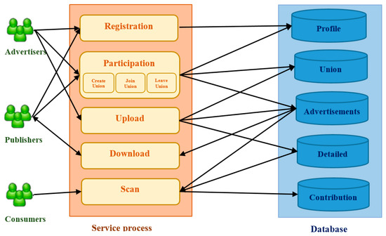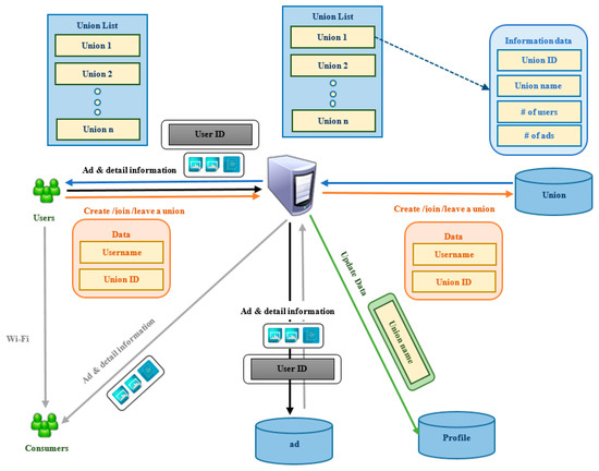 The participation process is shown in Figure 6. First, a user can request a union list from the server with the information union ID, union name, list of users, and list of advertisements in the union. Second, in order to participate in a union, a user will choose which action they want to implement, including: (1) Create a union; (2) Join a union; and (3) Leave a union. Third, the username and union ID will be sent to the server. Herein, username defines who sends the request, and the union ID defines which union the user wants to create, join, or leave. Finally, the server receives the username and union ID by HTTP GET method and updates the community name field of the user in the profile database.