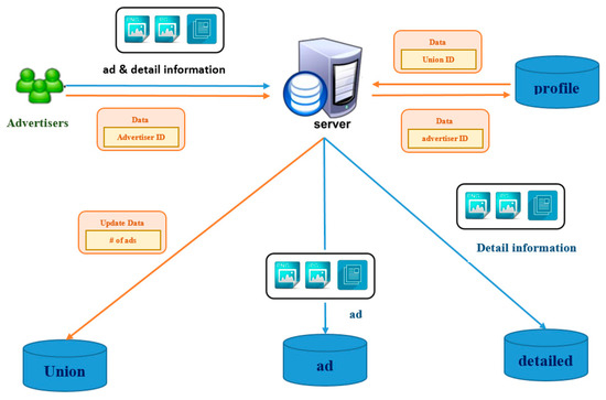 Figure 4 shows the architecture of an Internet advertising system. The processes can be listed as follows: registration, participation, upload, download, and scan. The user information such as account, password, and username will be kept in the profile database. The union database is to store the union information including the current list of unions in the system and the list of members in a union. The advertisement and the detailed information of the advertisement are respectively stored in the advertisements and detailed database. Finally, the server has to update the CP of the publisher according to the publisher ID to the contribution database.