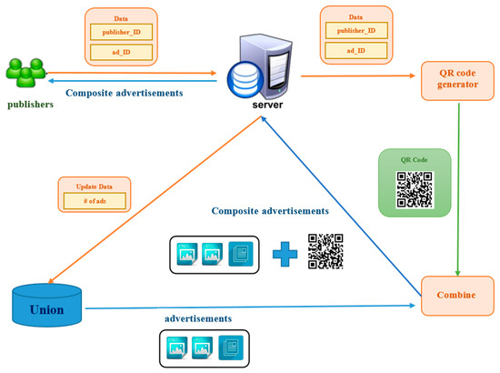 When a publisher decides to download one advertisement from the union, the publisher will send two parameters to the server through HTTP GET method. The downloading process is shown in Figure 8. Publisher ID describes the person who promotes this advertisement. Ad ID describes the advertisement which the publisher wants to broadcast. In download process, the server will execute two jobs: (1) generating a unique QR code and (2) combining the advertisement with the QR code.