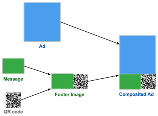 This process needs two pictures: an advertisement image, and a QR code image. The advertisement image can be requested by ad ID from the ad database. The combination process is shown in Figure 9. We modified the pictures by using ImageMagick. We firstly create a footer image which consists of a message and a QR code image. The message describes the use of the QR code. The ad content designed by an advertiser attracts consumers to scan this QR code to obtain more detailed information, such as an image of the menus or a fan club page.