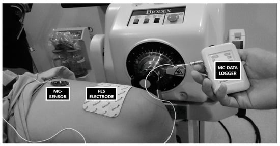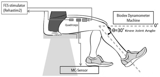 Instrumentation during FES-evoked muscle contractions using MC sensor with the angle of the knee joint set to 30° on Biodex Dynamometer.