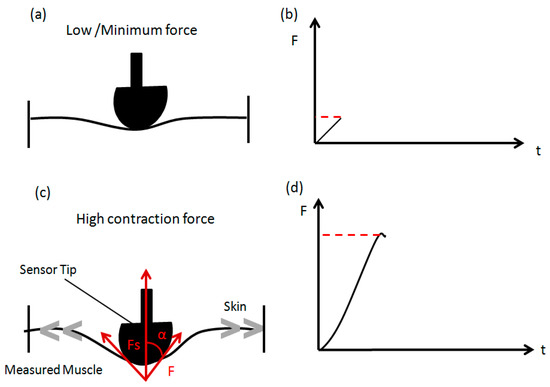Working principle of the MC sensor in detecting variation in muscle force during contraction. (a,b) Measured force signal during low contraction (c,d) Measured force signal during high contraction.