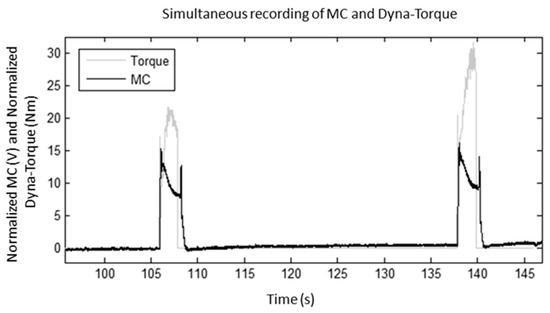 Simultaneous measurement of exemplar normalized dyna-torque and normalized MC voltage signals revealed that the amplitude of MC rose concurrently with the increase of FES-evoked muscle torque (Figure 5). When the muscle contraction was elicited by the neuromuscular stimulator, the MC recorded a change in tension in the rectus femoris muscle around the knee joint. One participant’s data was not included in the statistical analyses, because of ‘outlier’ findings, however this data has been deliberated upon in the Discussion.