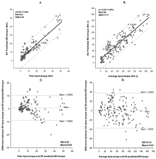 Consequently, the degree of association between isometric knee extension torque and predicted MC torque SP/SA was evaluated with the Coefficient of Determination (R2). Finally, to investigate the level of agreement between the SP/SA dyna-torque and SP/SA-predicted MC torque, Bland-Altman plots were constructed with 95% confidence limits of agreement and both bias (mean difference) and Lin’s concordance correlation coefficient (ρC) were calculated. All data were analyzed and plotted using Microsoft Excel (Microsoft Corporation, Redmond, WA, USA) and SigmaPlot 13.0 (SYSTAT Software Inc., San Jose, CA, USA).