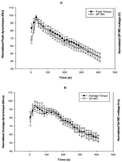 Rectus femoris fatigues in SCI participants represented by their mean normalized dyna-torque and mean normalized MC voltages during FES-evoked contractions (A) Peak dyna-torque and SP MC voltage throughout 30 contractions over 400 s; (B) Average dyna-torque and the SA MC-voltage throughout 30 contractions over 400 s. Data are mean ± standard error.
