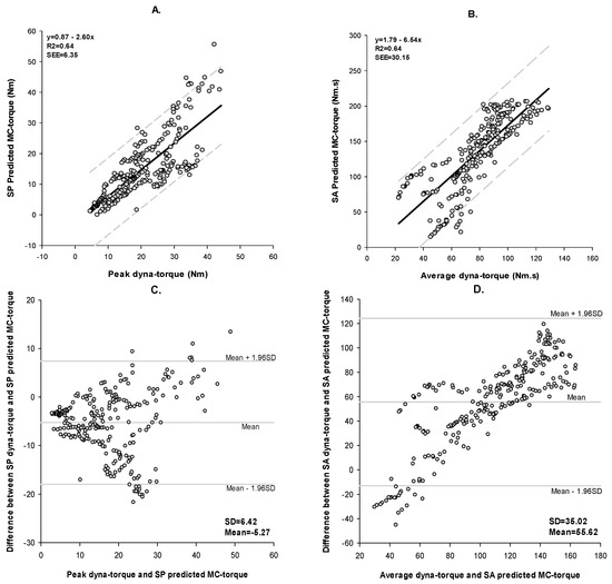 Linear regression and Bland-Altman plots between dyna-torque and the predicted MC torque. (A) Linear regression of peak dyna-torque and the MC-torque SP with 95% confidence bands; (B) Linear regression scatter plots of average dyna-torque and the MC-torque SA with 95% confidence bands; (C) Bland-Altman plots of peak dyna-torque and the Predicted MC-torque SP; (D) Bland-Altman plots of average dyna-torque and the Predicted MC-torque SA. Derivation of these variables has been described in the text.