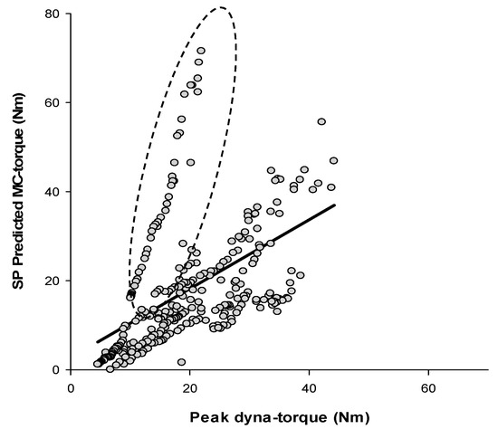 Regression analysis between Peak dyna-torque and SP predicted MC during the muscle fatigue experiment; includes 1 subject (data in dashed circle).