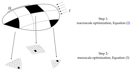 The optimization problem in Equation (1) is thus first solved at the macroscale, over a discretization of the whole structure consisting of finite elements. At this scale, the problem reads: