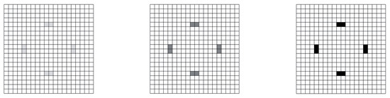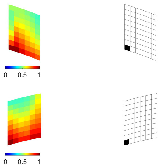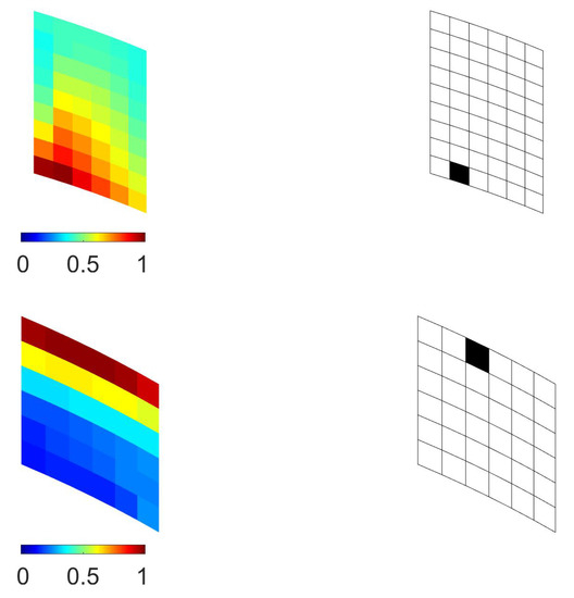 Concerning Case (1), the contour plot of the relevant objective function is shown in Figure 7: as expected, the sensitivity turned out to be higher near the point of application of the load, where a local variation of the response induced by damage became enhanced. The results of the macroscale optimization procedure are collected in Figure 8 at a varying value of : by enforcing the procedure to always place a sensor over a single element, so to have a pure 0–1 solution, it is shown that optimal placements were correctly obtained where the values of were higher, in compliance with the structural and loading symmetries for even values.