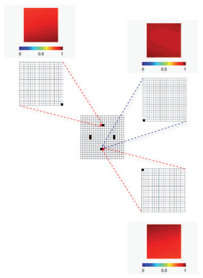 Moving from the macroscale results reported in Figure 2, the mesoscale analysis has been next carried out by assigning for each region previously identified; hence, it has been assumed that only one micro-sensor has to be placed in every meso-region. In compliance with the problem symmetry at the macroscale, the analysis of one single meso-region would be sufficient to provide the final results in terms of micro-positioning. To further check the capability of the method to provide consistent outcomes, independently of the enforcement of symmetry in the solution, the placements corresponding to two opposite mesoscale regions are reported in Figure 3 (see the shaded red regions). In this picture, not only the best sensor micro-placement is depicted (as a black area), but also the sensitivity of to the damage, which amounts to one at most due to the already discussed scaling term in the objective function. As a further validation, the solution was sought in a purposely wrong region nearby the one provided by the macro-analysis (see the shaded blue area), to see if the optimizer moves the sensor to the location closest to the optimal one. As shown, it turns out that the optimal and the sub-optimal placements in the chosen domains were contiguous, so the procedure led to really effective outcomes. In Figure 3, the insets provide the micro-sensor placements over the mesoscale space discretization, whereas the localization of meso-regions featuring higher sensitivity to damage had been obtained using the macroscale space discretization. Due to the length scale ratios , the space discretizations in the figure look all the same; indeed, even if a structured mesh of shell elements had been adopted in all of the simulations, appropriate boundary and loading conditions had been always allowed for in each analysis, according to what was described in Section 2.