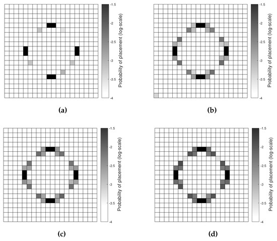 In Figure 4, the resulting probability of sensor placement is shown at varying values of and, therefore, of standard deviation . As expected, by increasing the measurement noise, the plot of the optimal configuration became more and more blurred, becoming different from the purely deterministic solution of Figure 2. Nevertheless, the most probable positions (namely, the highest values of placement probability) turn out to be independent of the measurement noise.